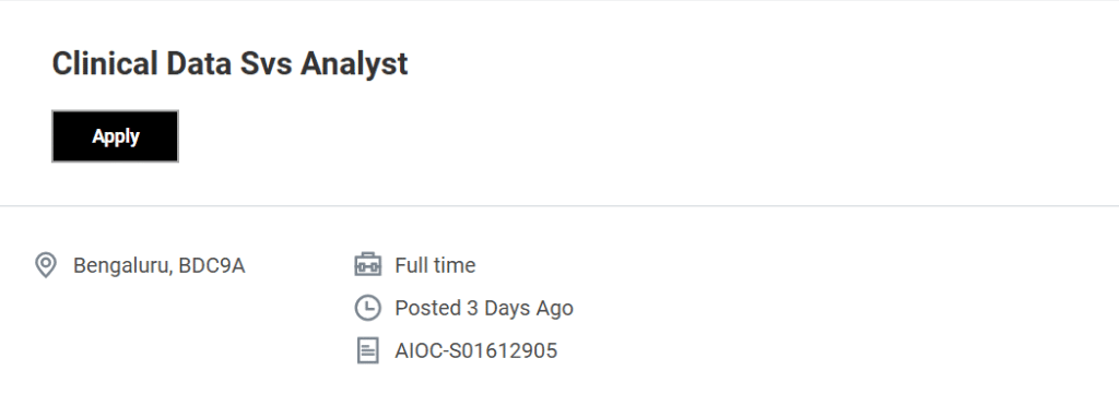 - Navigate to the Careers section and search for Job ID: AIOC-S01612905 or “Clinical Data Services Analyst.”