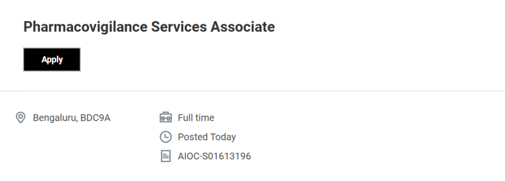 - In the search bar, enter the Job Requisition ID: AIOC-S01613196 or search for “Pharmacovigilance Services Associate Bengaluru”.