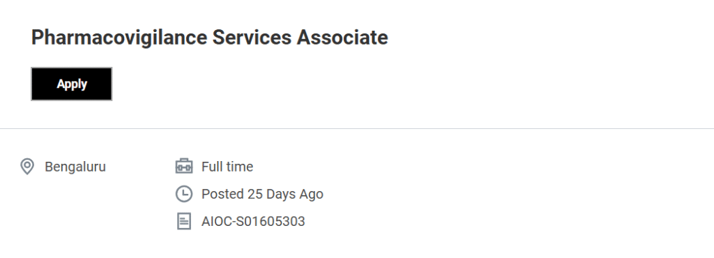 - Experience: 1 to 3 years in pharmacovigilance, drug safety, or clinical research