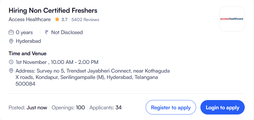 Are you a pharmacy graduate looking for your first job in the healthcare industry? Here’s your chance to begin your professional journey with one of India’s most respected healthcare companies. Access Healthcare is conducting a mega walk-in drive for non-certified pharmacy freshers in Hyderabad. This is a great opportunity for candidates who have completed B.Pharm, D.Pharm, or Pharm.D and are eager to start their career in the healthcare and clinical research industry. Access Healthcare Hiring Non Certified Freshers / Pharmacy Graduate