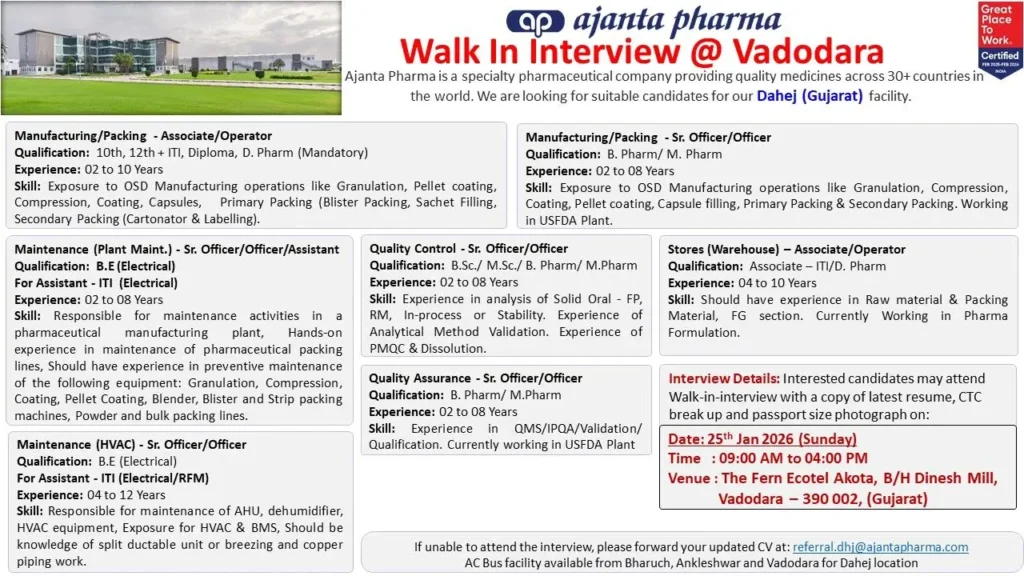 Ajanta Pharma is hiring for multiple roles across Manufacturing, Packing, Quality Control, Quality Assurance, Maintenance, HVAC, and Warehouse operations at its Dahej facility. All roles operate in a GMP- and USFDA-compliant manufacturing environment. Ajanta Pharma Walk In for Manufacturing QC QA