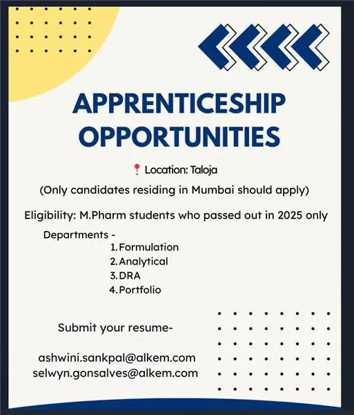This apprenticeship program at Alkem Taloja (Mumbai) is designed for fresh M.Pharm graduates who are looking to build a strong foundation in the pharmaceutical industry. Apprentices will work under the mentorship of experienced professionals and gain practical exposure to core domains in pharmaceutical sciences. Alkem Apprenticeship Hiring for Regulatory Affairs