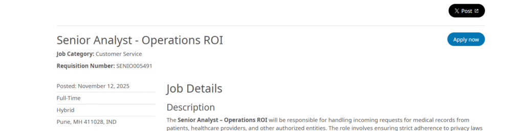 The Senior Analyst – Operations ROI role in Pune offers a solid foundation for professionals aspiring to build a long-term career in US healthcare operations. It combines data accuracy, compliance knowledge, and healthcare communication skills into one impactful role. If you are detail-oriented, analytical, and passionate about healthcare processes, this is your chance to make a difference in the world of medical information management. Analyst Operations ROI US Healthcare Jobs in Pune