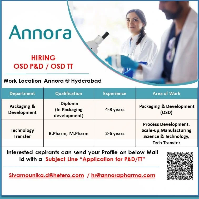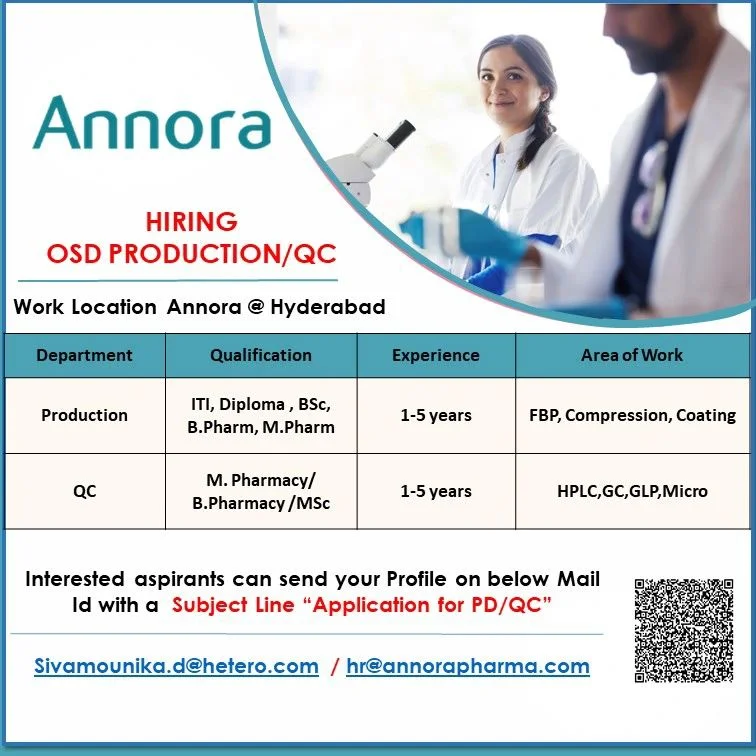 Candidates with relevant pharmaceutical industry experience and exposure to OSD formulations are encouraged to apply. Annora Pharma Hiring for OSD Production QC PD