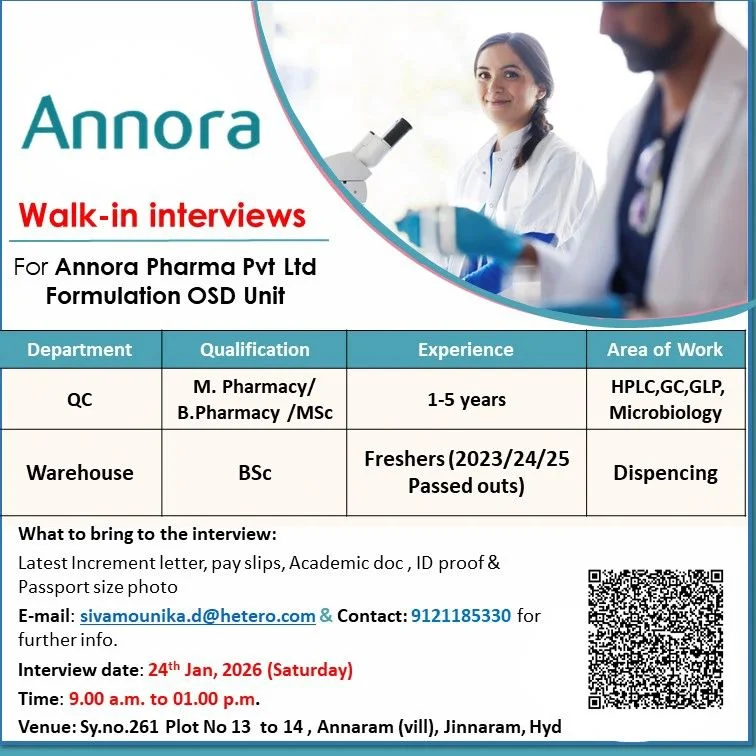 Annora Pharma Pvt Ltd has announced walk-in interview opportunities for Quality Control (QC) and Warehouse departments at its Hyderabad manufacturing facility. These openings are suitable for both experienced professionals and freshers from recent academic years. Annora Pharma Hiring Freshers for QC Warehouse