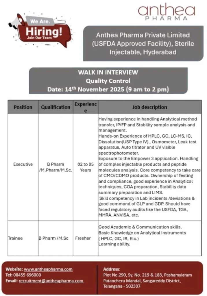 Walk in on 14th November 2025 and take the next step toward a rewarding career in the pharma industry with Anthea Pharma Hyderabad. Anthea Pharma Hiring Freshers for QC Executive / Trainee Jobs