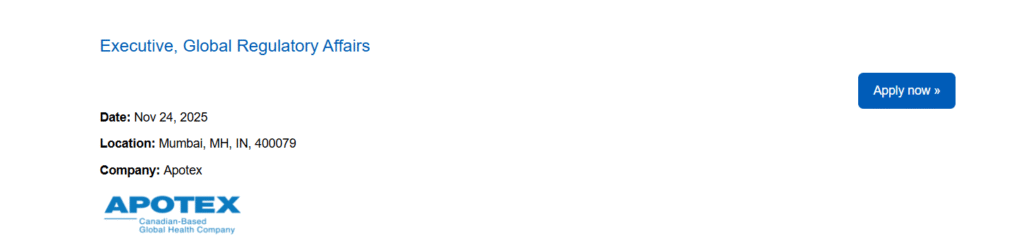 Apotex, a globally recognized pharmaceutical organization headquartered in Canada, is inviting applications for the position of Executive, Global Regulatory Affairs in Mumbai. This is a major opportunity for professionals with experience in regulatory submissions, product life-cycle management, and compliance across major international markets such as the US, Canada, EU, Australia, and New Zealand. Apotex Hiring for Executive Global Regulatory Affairs