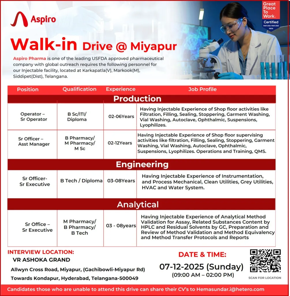 Aspiro Pharma, one of India’s fastest-growing USFDA-approved injectable pharmaceutical companies, is conducting a mega walk-in interview on 7th December 2025 in Hyderabad for hiring experienced professionals across Production, Engineering, and Analytical departments at its state-of-the-art injectable manufacturing facility located in Karkapatla, Siddipet. Aspiro Pharma Hiring for Production Engineering Analytical