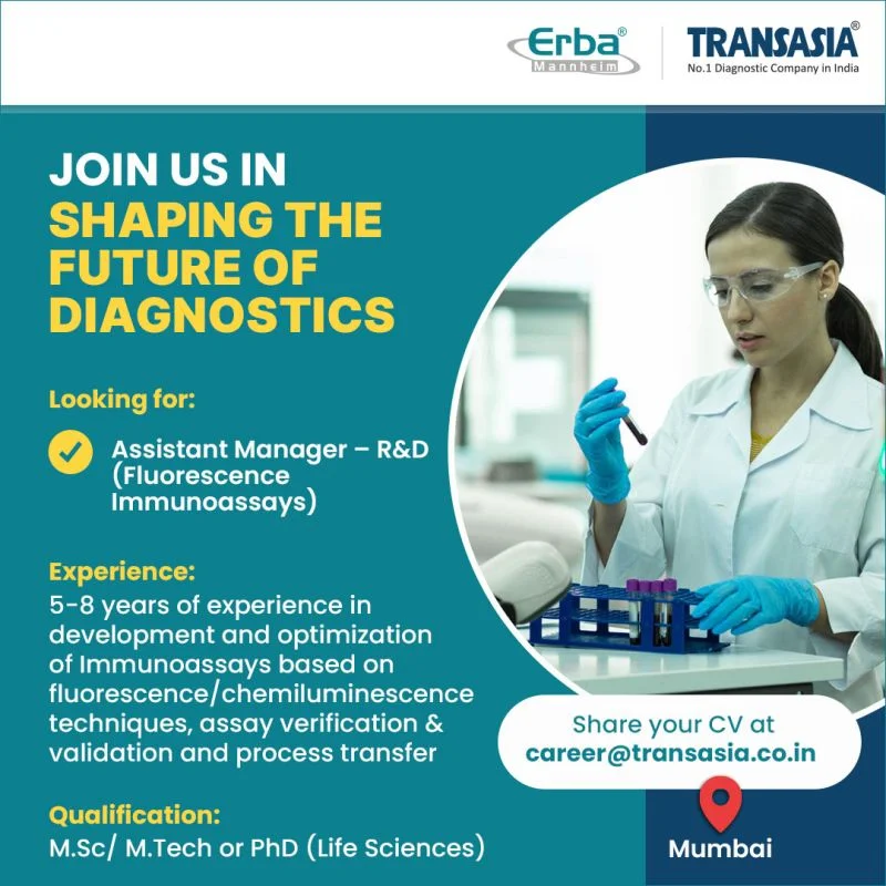 Erba Transasia, part of the globally renowned Erba Mannheim group, is hiring an experienced professional for the position of Assistant Manager โ R&D (Fluorescence Immunoassays) at its Mumbai location. This opportunity is ideal for scientists and researchers with strong expertise in fluorescence and chemiluminescence immunoassay development who are looking to advance their careers in the diagnostics industry.