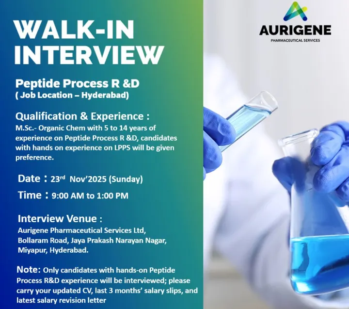 Aurigene Pharmaceutical Hiring for Peptide Process R&D Jobs: Walk-In Interview on 23 November 2025