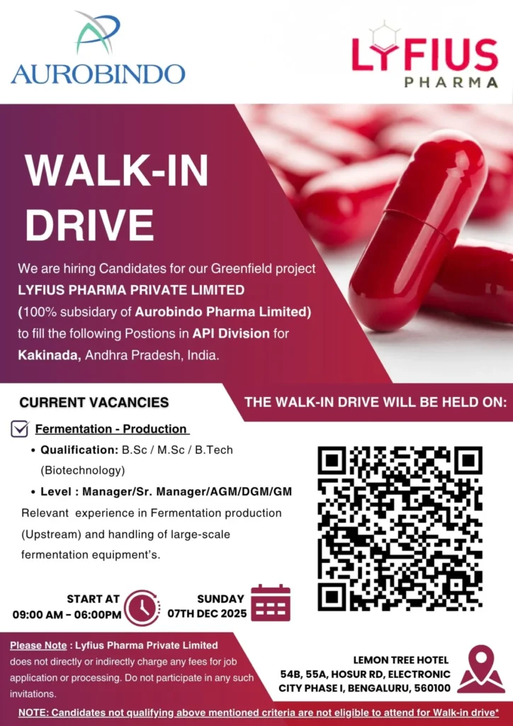 The walk-in drive will be held on Sunday, 7th December 2025, at Lemon Tree Hotel, Electronic City, Bengaluru. This hiring initiative presents a significant opportunity for skilled biotechnology professionals to work on a greenfield project within a world-class manufacturing setup backed by Aurobindo’s excellence in API and formulations manufacturing. Aurobindo Pharma Lyfius Pharma Hiring for Production Job