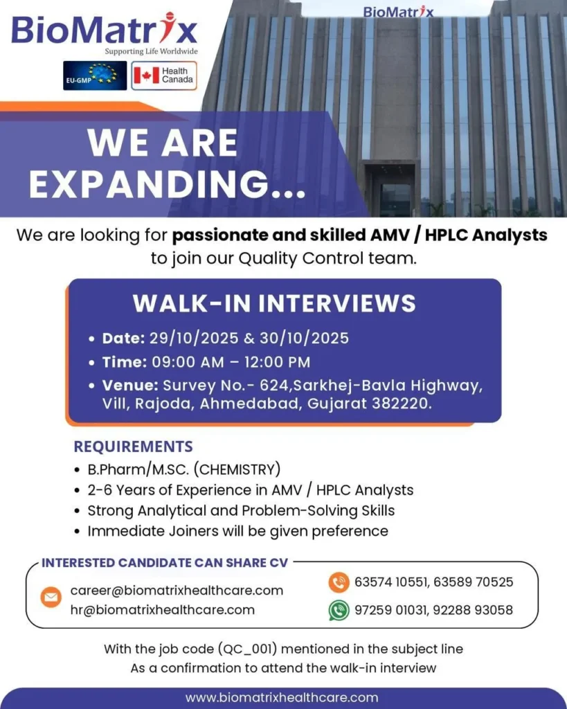 BioMatrix Healthcare Hiring for Quality Control Department (AMV/HPLC Analyst) roles in Ahmedabad. Walk-in interview on October 29–30, 2025.
