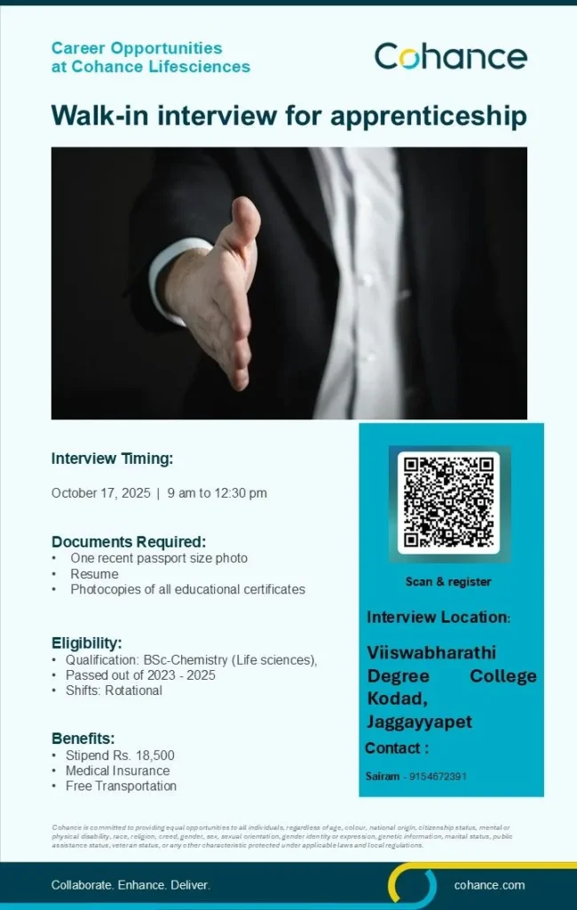 Cohance Lifesciences is offering Apprenticeship opportunities exclusively for fresh graduates (2023–2025 batches). This apprenticeship program is conducted in collaboration with Viswabharathi Degree College, Jaggaiahpeta, and is designed to provide hands-on industry experience in API manufacturing, laboratory operations, and quality systems.
