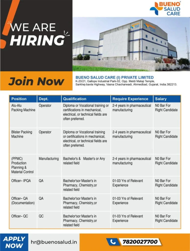 👉 Join Bueno Salud Care and build a rewarding pharmaceutical career in Ahmedabad! Bueno Salud Care Hiring for Operator / QA / QC / PPMC Officer