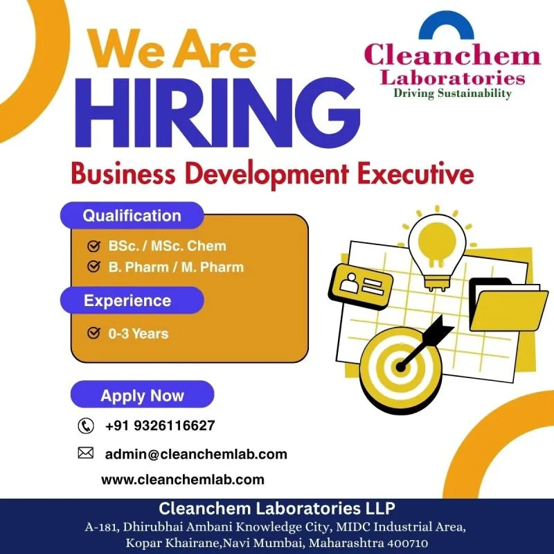 Business Development Executive job at Cleanchem Laboratories for freshers. Check eligibility, salary, skills, and apply via email or phone today.