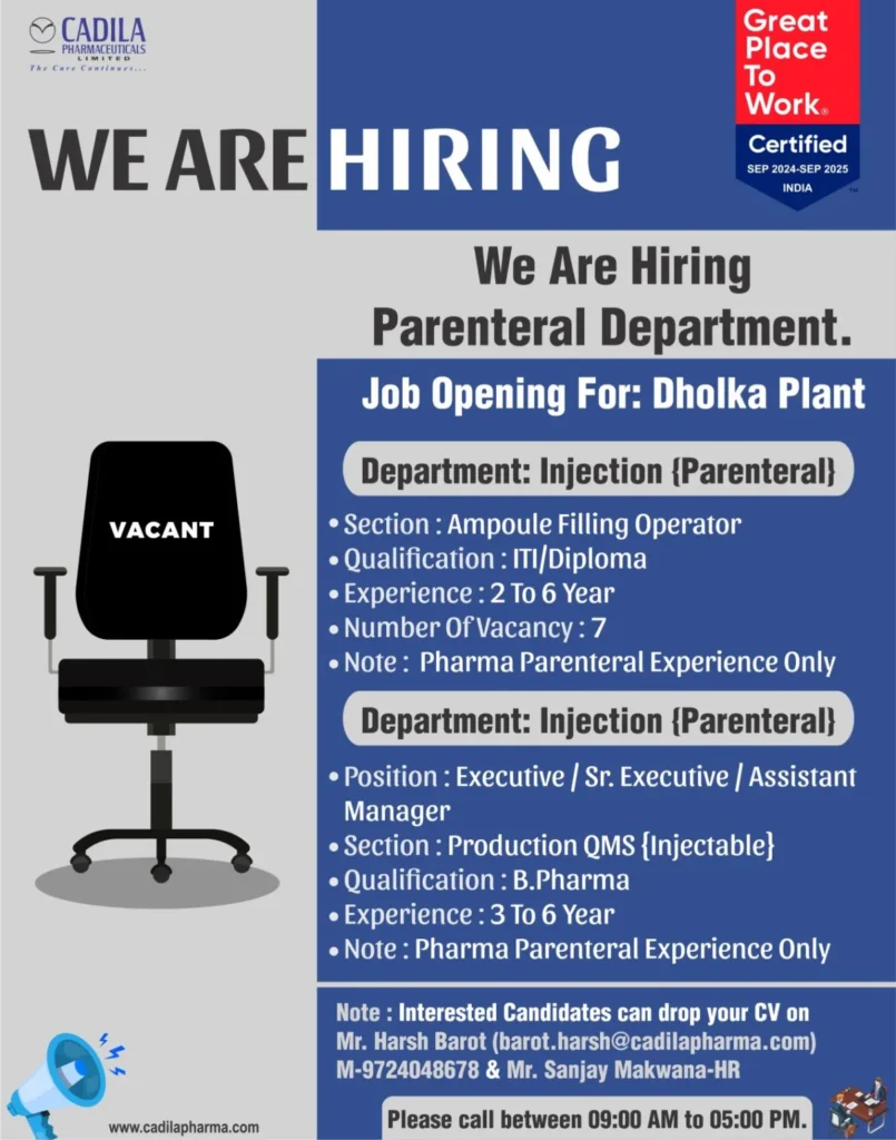 Are you ready to build your career with one of India’s most respected pharmaceutical companies? Cadila Pharmaceuticals Limited, a Great Place To Work® Certified organization, is inviting applications for Injection (Parenteral) Team positions at its Dholka Plant. Cadila Pharma Hiring for Injection Teams