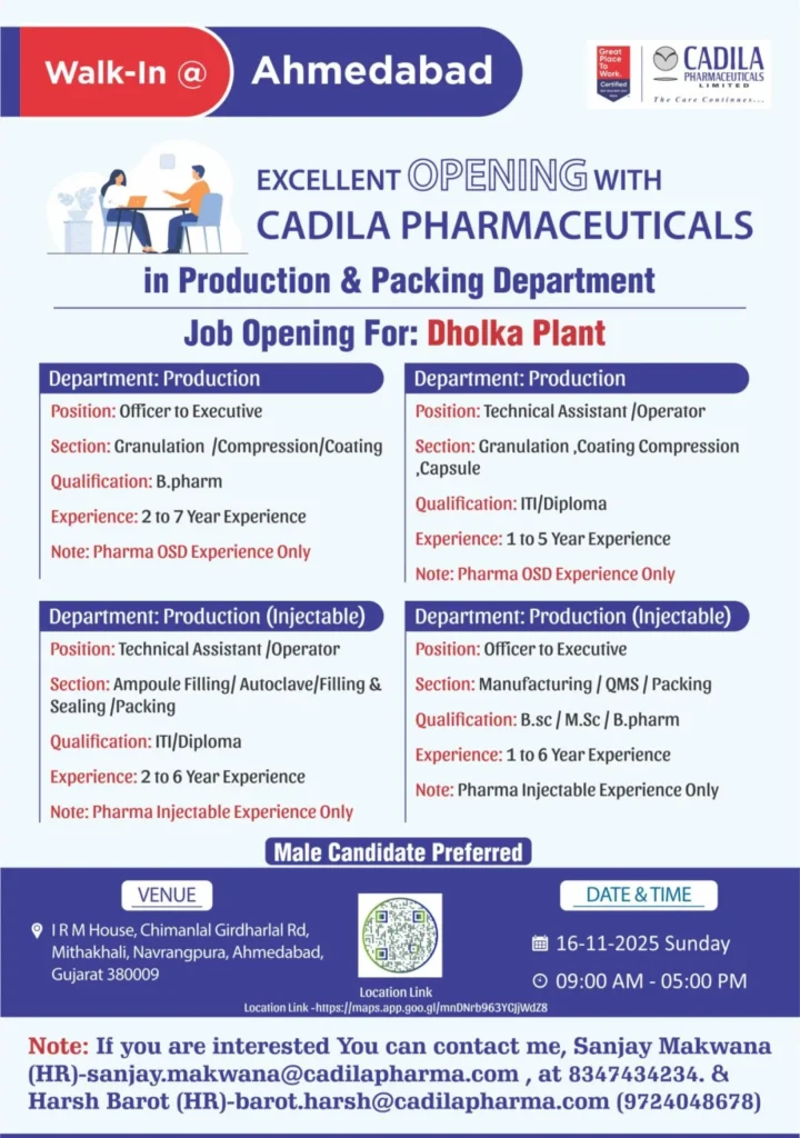 Cadila Pharmaceuticals will conduct two major walk-in drives for Production, QC, and QA departments: