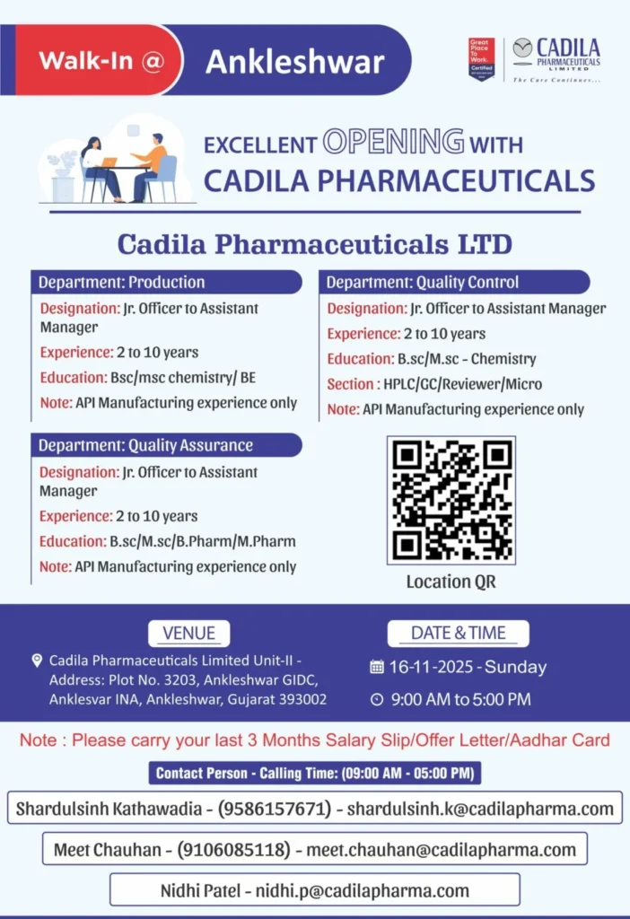 Cadila Pharmaceuticals Limited, one of India’s most respected and rapidly expanding pharmaceutical organizations, has officially announced two large-scale walk-in drives for multiple positions in Production, Quality Control (QC), and Quality Assurance (QA). The company, recognized as a Great Place To Work® Certified employer, is opening its doors for skilled professionals with relevant pharmaceutical manufacturing experience. These walk-in interviews will be held on 16th November 2025 (Sunday) at two major locations: Dholka (Ahmedabad) and Ankleshwar Unit-2. Cadila Pharmaceuticals Hiring for Production / QC / QA