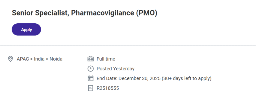 Position: Senior Specialist – Pharmacovigilance (PMO)