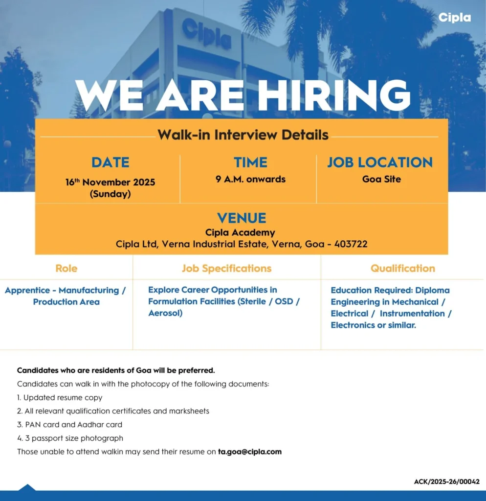 Cipla Limited, one of India’s most trusted pharmaceutical companies, is offering an incredible opportunity for fresh diploma engineers through its Apprentice – Manufacturing and Production program at the Verna, Goa facility. This Cipla walk-in interview 2025 is your gateway to joining a world-class pharmaceutical manufacturing environment that emphasizes innovation, learning, and long-term career growth. Cipla Hiring Freshers for Apprentic Manufacturing / Production