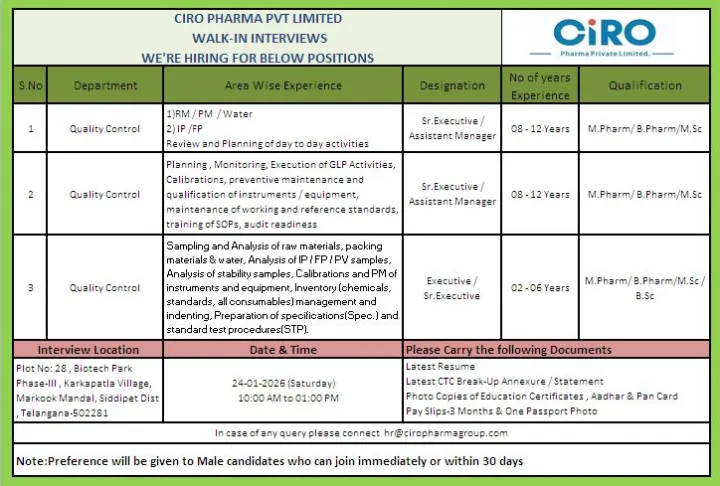This walk-in interview presents a strong opportunity to join CIRO Pharma Private Limited and build a rewarding career in pharmaceutical Quality Control within a GMP- and GLP-compliant environment. CIRO Pharma Hiring for Quality Control Roles