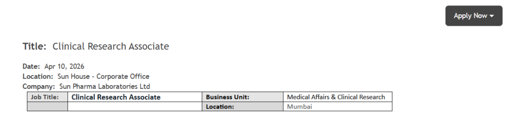 Clinical Research Associate job at Sun Pharma Mumbai. Check eligibility, experience, responsibilities, and apply online for clinical research role today now.