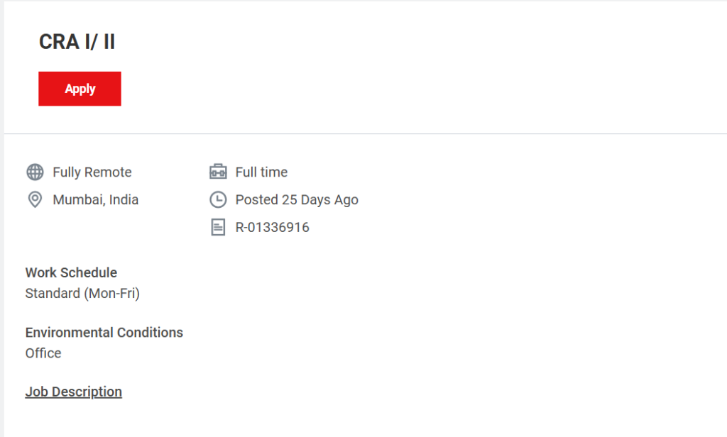 Thermo Fisher Scientific is hiring Clinical Research Associates (CRA I / CRA II) for a fully remote role based in Mumbai. This position is ideal for clinical research professionals with 1โ1.5 years of on-site monitoring experience who want to work on global clinical trials while adhering to ICH-GCP and regulatory standards. Clinical Research Associate Jobs at Thermo Fisher Scientific