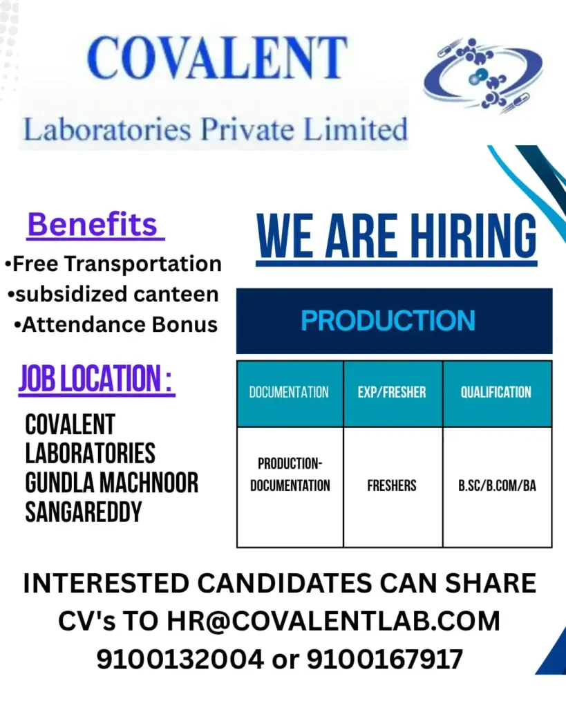 Covalent Laboratories Hiring Freshers for Production Jobs Documentation jobs in Telangana 2025. Apply now for full-time pharma career opportunities.
