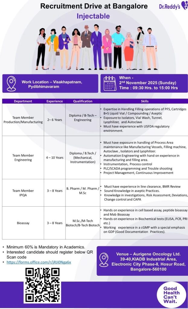 This walk-in event is designed for professionals with proven experience in injectable operations, manufacturing processes, biotechnology, and quality assurance. Candidates meeting the eligibility criteria are encouraged to attend the interview with all relevant documents and certifications. Dr. Reddy’s Hiring for Injectable Manufacturing / Engineering / IPQA / Bioassay
