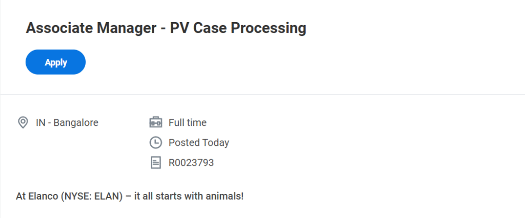 Elanco Hiring Associate Manager PV Case Processing in Bangalore. Apply now for top pharmacovigilance job opportunities in India.