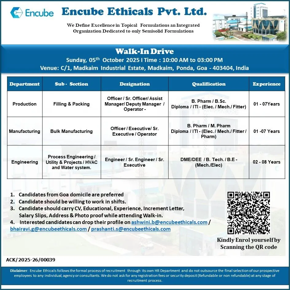 Encube Ethicals Pvt. Ltd., a leader in topical formulations, is conducting a Walk-In Recruitment Drive at its world-class manufacturing facility in Goa. This is a chance to be part of a pioneering pharmaceutical company known for its expertise in semisolid formulations. Encube Ethicals Hiring for Production / Manufacturing / Engineering