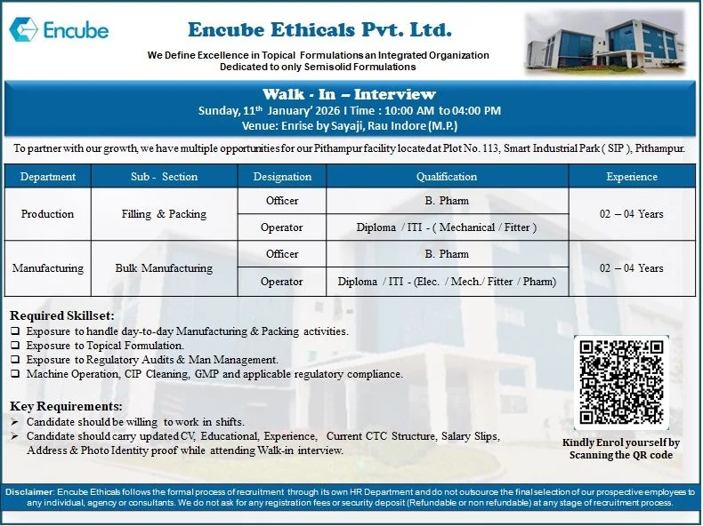 Candidates may also enroll themselves by scanning the QR code provided in the official notification. Encube Ethicals Hiring for Production Manufacturing Jobs