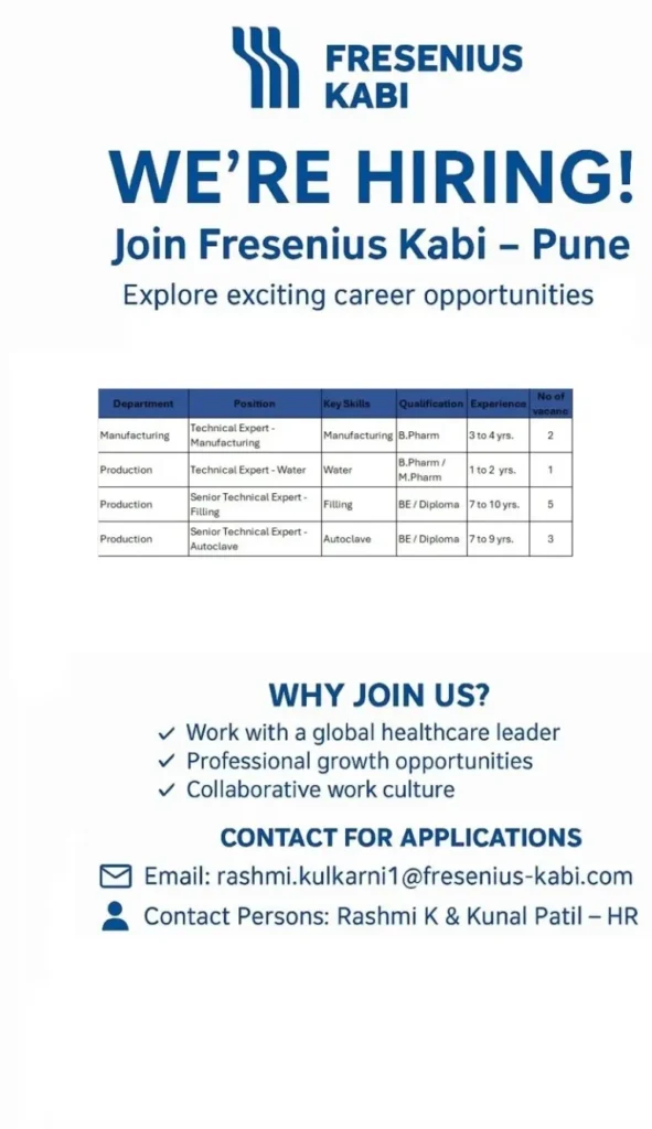 Fresenius Kabi’s recruitment drive in Pune offers an excellent career opportunity for experienced pharmaceutical professionals seeking to work in a reputed and globally recognized organization. With multiple openings in manufacturing, filling, autoclave, and water system departments, this is the ideal time to advance your career in sterile injectable manufacturing. Fresenius Kabi is Hiring for Manufacturing / Production Filling / Autoclave
