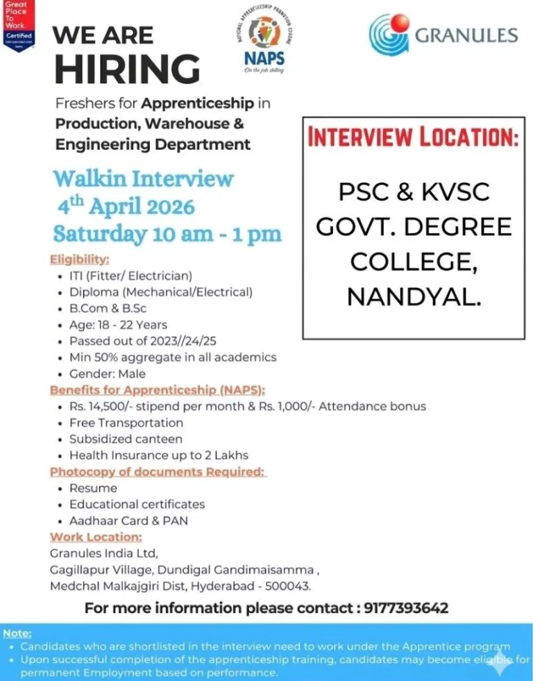 This Freshers Hiring at Granules India 2026 is a great starting point for candidates who want to enter the pharmaceutical industry. The apprenticeship program provides structured training, practical exposure, and the opportunity to learn industry-standard processes.