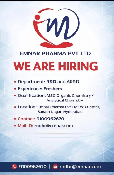 Emnar Pharma Pvt. Ltd. is offering an excellent career opportunity for fresh postgraduate candidates to begin their journey in pharmaceutical research. The company is currently hiring for Research and Development (R&D) and Analytical Research and Development (AR&D) roles at its Hyderabad facility. This opening is ideal for candidates who are passionate about scientific research and want to gain practical exposure in a regulated pharmaceutical environment.
