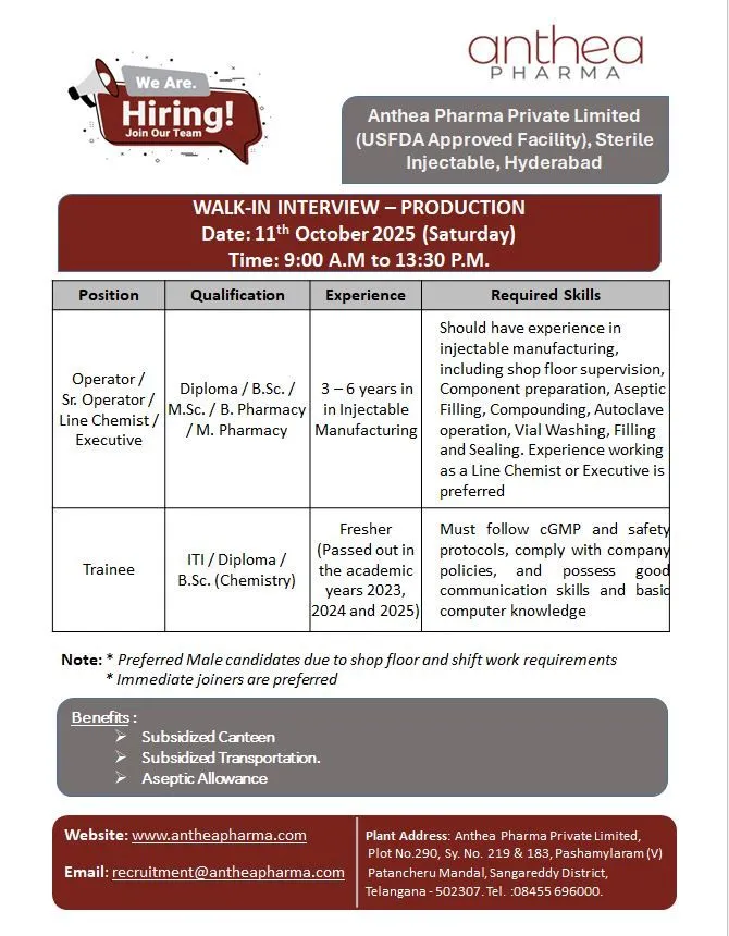 Freshers Job Anthea Pharma Hiring for Production in Telangana. Attend walk-in interview on 11th October 2025 for freshers and experienced.