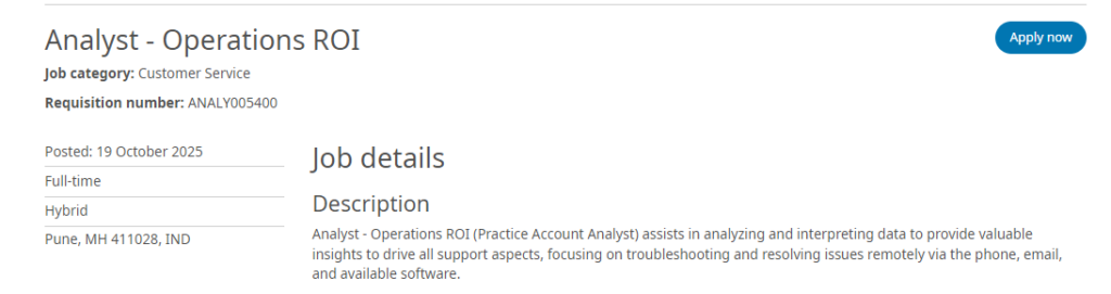 This Analyst – Operations ROI position at MRO (Clinical Data Exchange) in Pune offers an excellent opportunity for freshers and early-career professionals from life sciences or pharmacy backgrounds. If you aspire to grow in healthcare operations and data analytics, this role provides the right platform to start and develop your professional journey. Freshers Job for Analyst Operations ROI at MRO