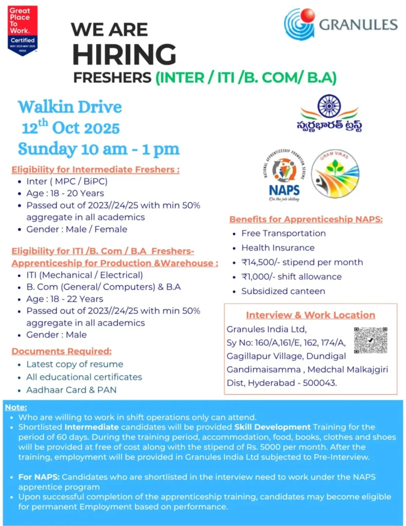 Freshers Job Granules Hiring for NAPS Apprenticeship Program 2025 in Hyderabad. Apply now for training, stipend, and job opportunity!