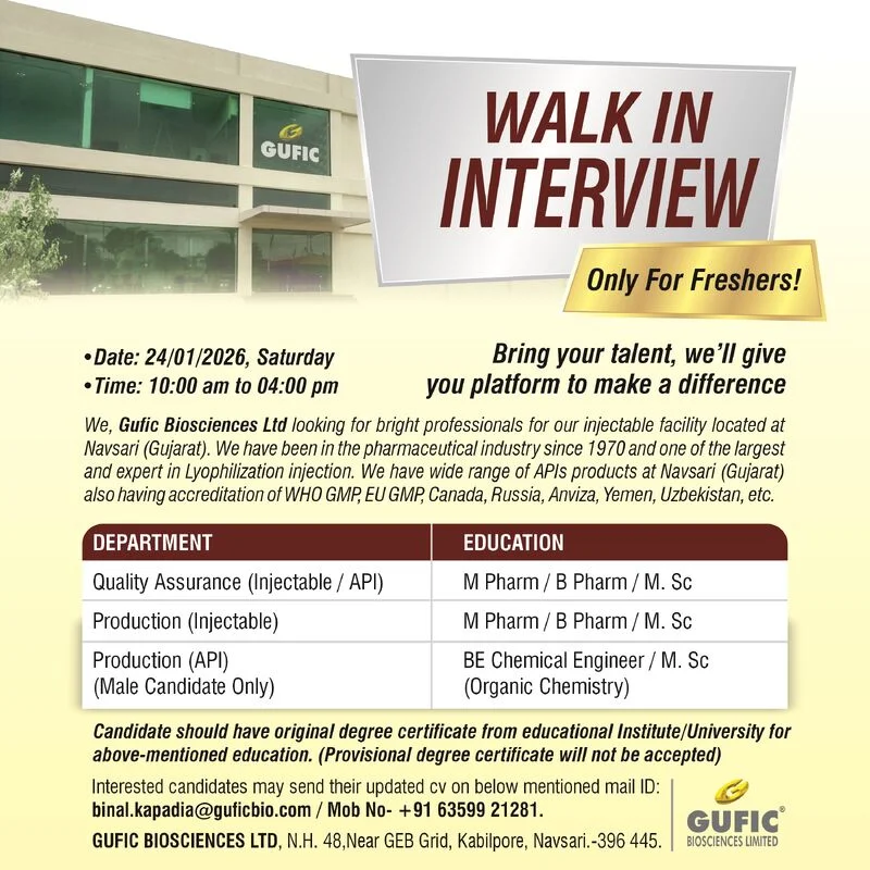 Gufic Biosciences Limited is conducting a walk-in interview exclusively for freshers who are eager to begin their careers in pharmaceutical Quality Assurance and Production. The selected candidates will work at the companyโs advanced manufacturing facility in Navsari, which is known for its expertise in lyophilized injectables and API manufacturing. Freshers Jobs for QA Production