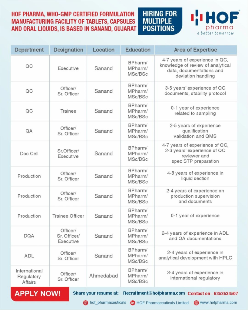Freshers Pharma Jobs in QC QA Production at HOF Pharmaceuticals roles in Gujarat for freshers and experienced pharma professionals.