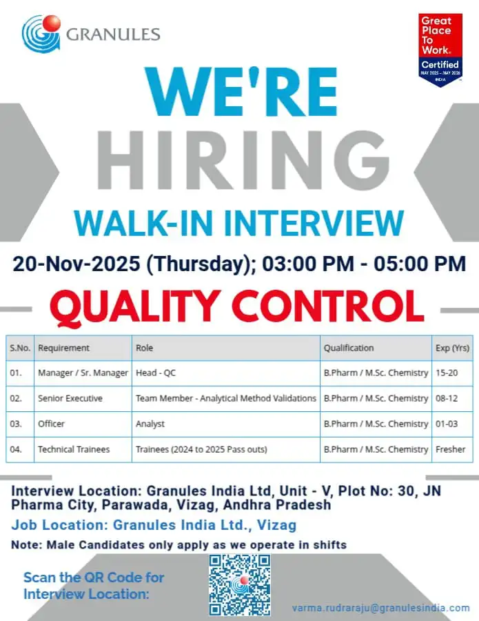 Granules India Hiring for Quality Control OSD Jobs B.Pharm and M.Sc candidates in Vizag with walk-in interviews on 20 November.