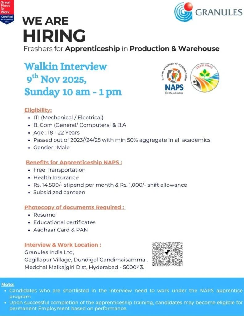 Whether you are from a technical background (ITI Mechanical/Electrical) or a non-technical stream (B.Com/B.A), Granules India’s apprenticeship provides a strong platform to develop your professional career in pharma operations. Granules India Hiring Freshers for Production / Warehouse