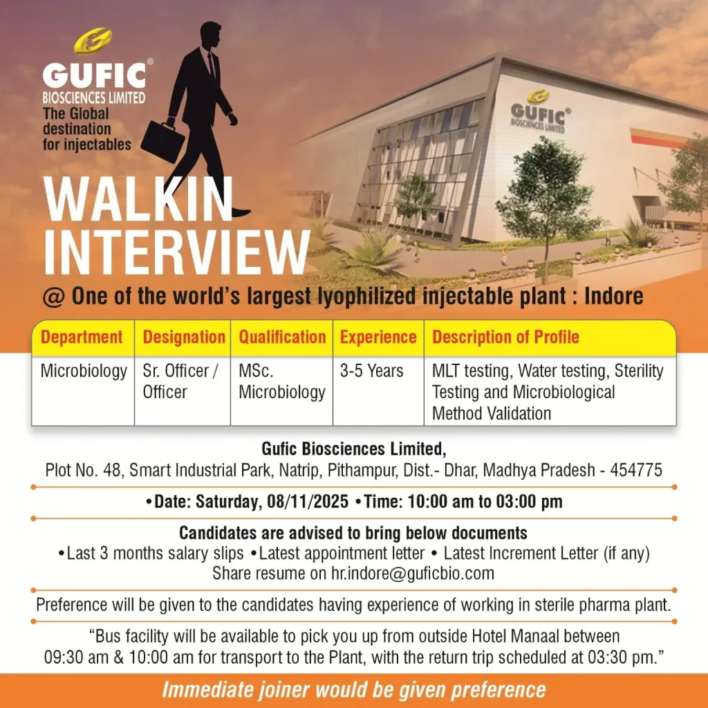 This recruitment drive is specifically designed for experienced microbiologists who are seeking stable, growth-oriented careers in the sterile injectables manufacturing sector. With its state-of-the-art facility located at Pithampur (Dhar, Madhya Pradesh), Gufic Biosciences continues to expand and innovate in the field of lyophilized injectables and sterile pharmaceutical production.