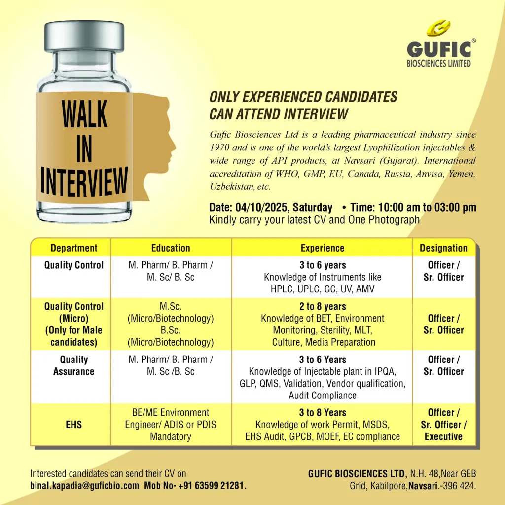 To expand its workforce, Gufic is conducting a Walk-In Interview on October 4, 2025, for experienced professionals in Quality Control (Analytical), Quality Control (Microbiology), Quality Assurance (QA), and Environment, Health & Safety (EHS).