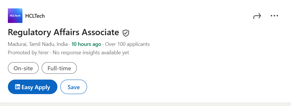 The HCLTech Regulatory Affairs Associate position in Madurai is a fantastic opportunity for regulatory and quality professionals seeking to grow their careers in the medical device industry. With HCLTech’s global exposure, structured growth paths, and commitment to employee excellence, this role provides both professional development and job satisfaction. HCLTech Hiring for Regulatory Affairs Associate