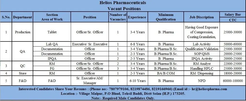 Below is a detailed breakdown of available positions, eligibility criteria, and responsibilities: Helios Pharma Hiring for Production / QA / QC / FD