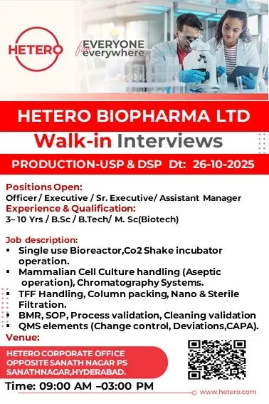 Hetero Biopharma Hiring for Production (USP & DSP) roles on 26th October 2025 at Hyderabad. Candidates with 3–10 years of experience in Biopharma Production can apply.