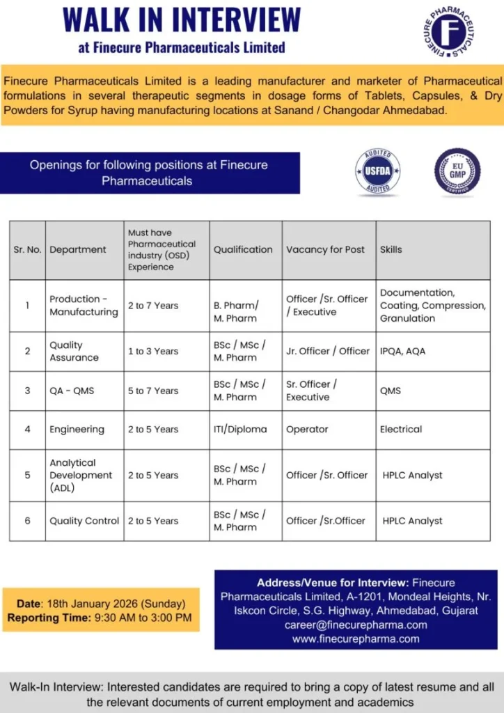 Finecure Pharmaceuticals Limited is conducting a walk-in interview to hire experienced professionals across multiple departments including Production, Quality Assurance, Quality Control, Analytical Development Laboratory (ADL), and Engineering. Hiring for Production QA QC ADL Engineering Roles
