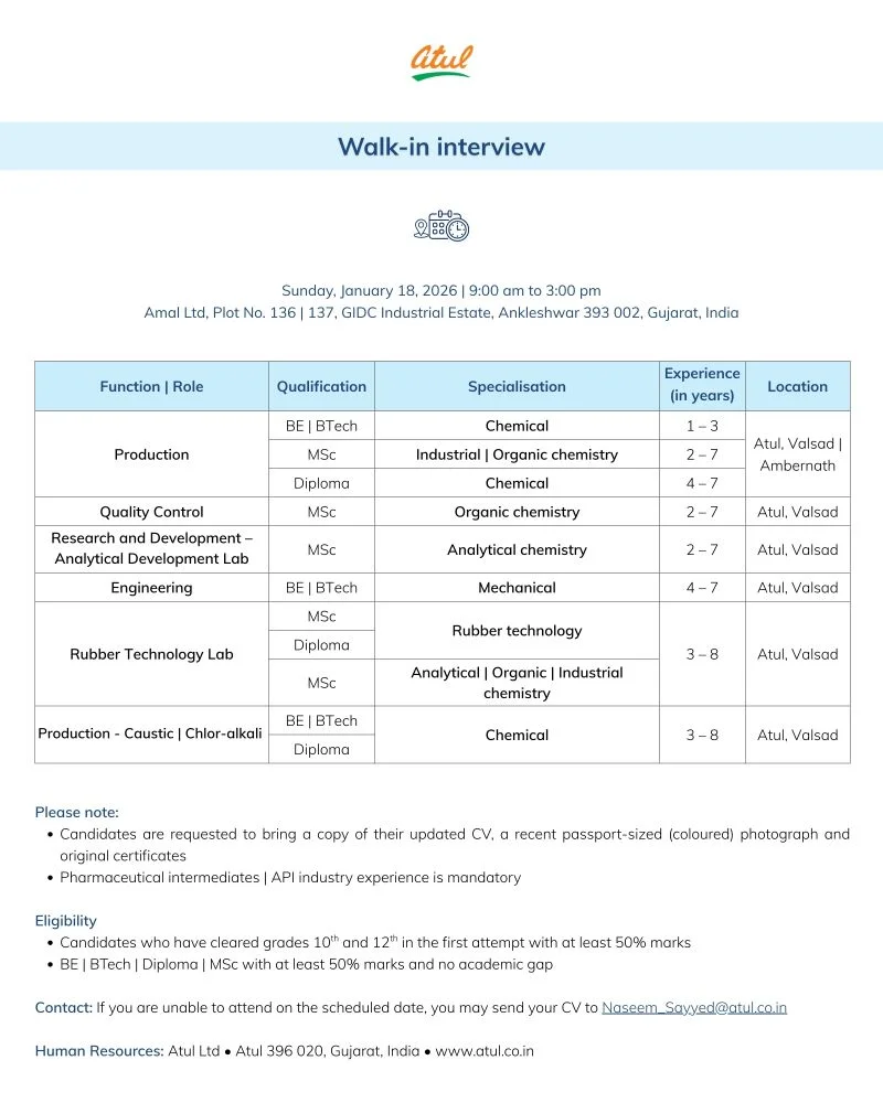 Atul Ltd, one of Indiaโs most respected and diversified integrated chemical companies, has announced a major walk-in recruitment drive for January 2026. This hiring initiative is focused on strengthening its Production, Quality Control, Engineering, and Research & Development teams across its Gujarat manufacturing locations.
