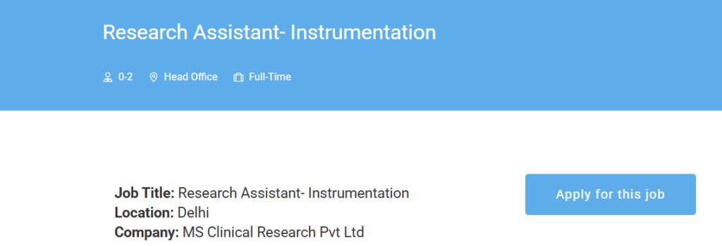 Interested and eligible candidates can apply by submitting their updated resume along with relevant educational and experience details to MS Clinical Research Pvt. Ltd. Applications should clearly mention the job title โResearch Assistant โ Instrumentationโ in the subject line. MS Clinical Research Hiring Research Assistant Instrumentation